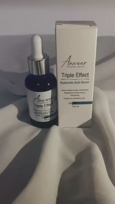 سيروم الهيالورونيك أسيد المتقدم ذو الفعالية الثلاثية المدعم بڤيتامين B5 و VE الذي يعمل على إصلاح البشرة وتجديدها والتخلص من خطوط التجاعيد والخطوط الدقيقة في البشرة والمحافظة على شباب البشرة وتعزيز ترطيبها وتفتيحها وزيادة نضارتها وجمالها.